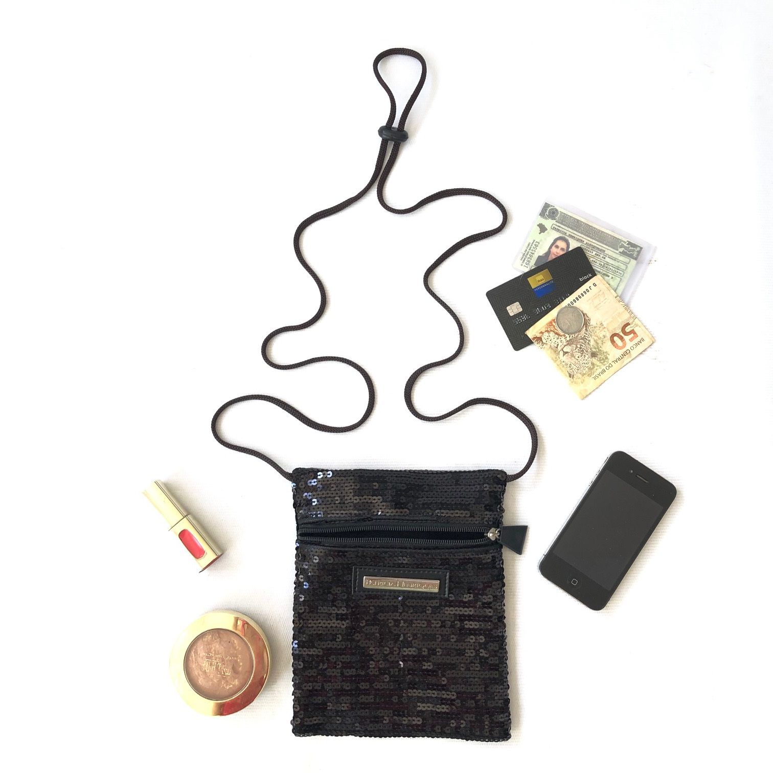 Bolsinha ou porta celular ou necessaire feita em paetês com colar em cadarço de algodão. Ela cabe nosso celular documentos, dinheiro, chave: tudo que precisamos para curtir o carnaval. Ela é super leve, estilosa, e linda! Este acessório Patricia Henriques tem design exclusivo e é super leve e moderno. Nossa bolsinha colar tem tamanho perfeito, confira!